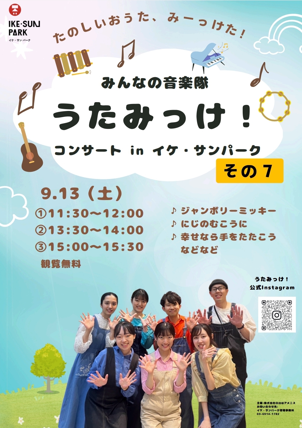 JP EN 新着情報 TOP 新着情報 【9月13日(土)】 『みんなの音楽隊 うたみっけ!』コンサート開催! NEWS 2025.09.06 【9月13日(土)】 『みんなの音楽隊 うたみっけ!』コンサート開催! みんなの音楽隊 うたみっけ! コンサート inイケ・サンパーク 9月13日(土) 全三回 開催✨ 場所:芝生内三角屋根テント付近 内容:童謡・子ども向けの楽曲の演奏 主催:イケ・サンパーク 実施団体:みんなの音楽隊 うたみっけ!(イケ・サンパークボランティア登録団体) 前へ一覧に戻る次へ