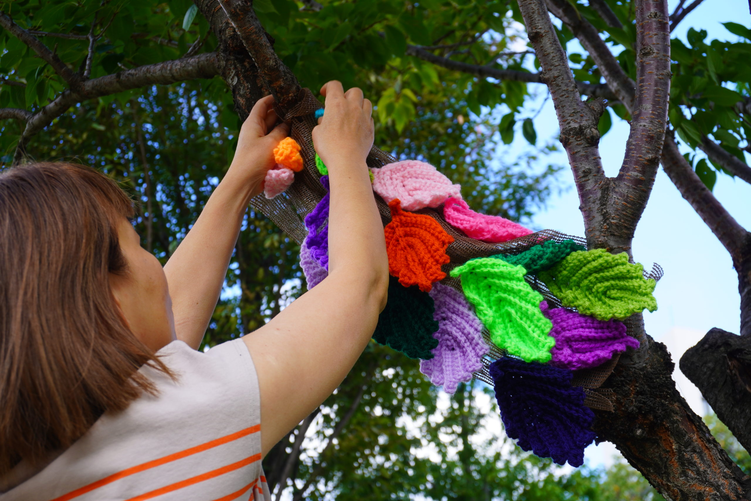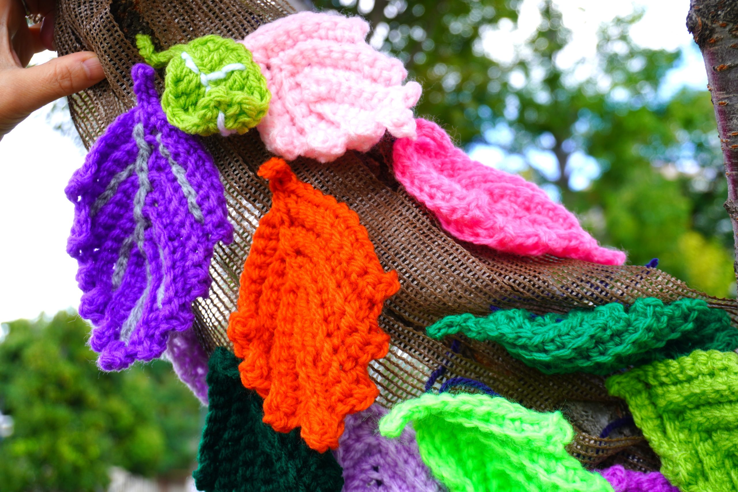 「毛糸で編んだ葉っぱ」を木に飾って、あみものツリーをつくります!🧶