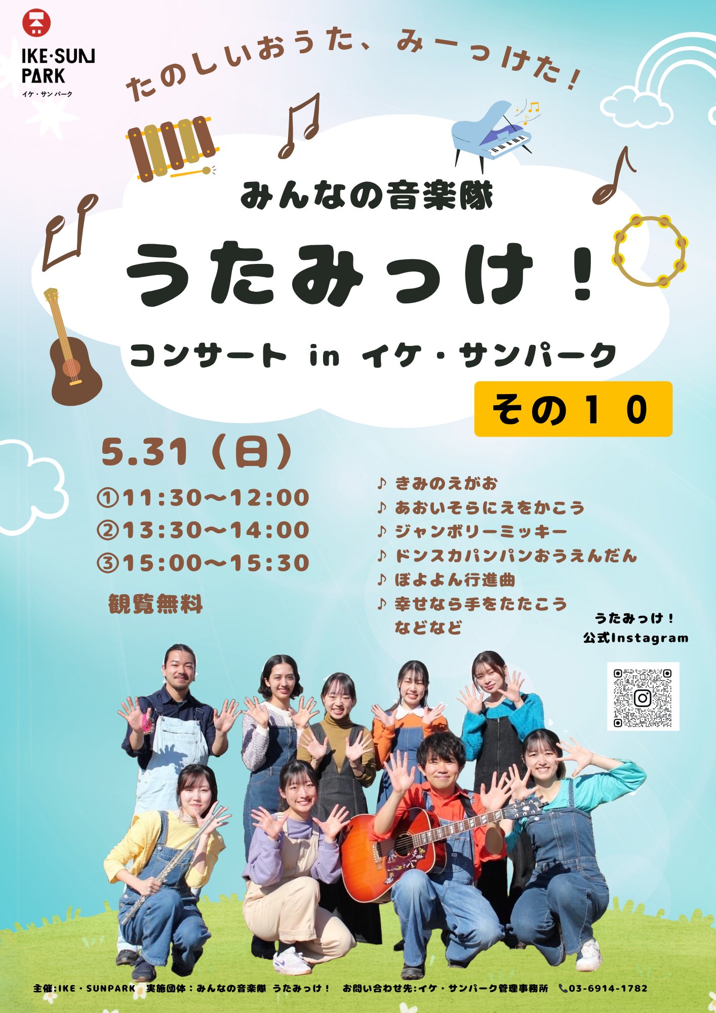 JP EN 新着情報 TOP 新着情報 【5月31日(日)】『みんなの音楽隊 うたみっけ!』コンサート開催! NEWS 2026.04.09 【5月31日(日)】『みんなの音楽隊 うたみっけ!』コンサート開催! たのしいおうた、みーっけた! みんなの音楽隊 うたみっけ! 開催日:5/31(日) 時間:①11:30~12:00 ②13:30~14:00 ③15:00~15:30 内容:童謡・子ども向けの楽曲の演奏 主催:イケ・サンパーク 実施団体:みんなの音楽隊 うたみっけ! (イケ・サンパークボランティア登録団体) 観覧は無料!皆さんのご来園をお待ちしております🎶 前へ一覧に戻る次へ