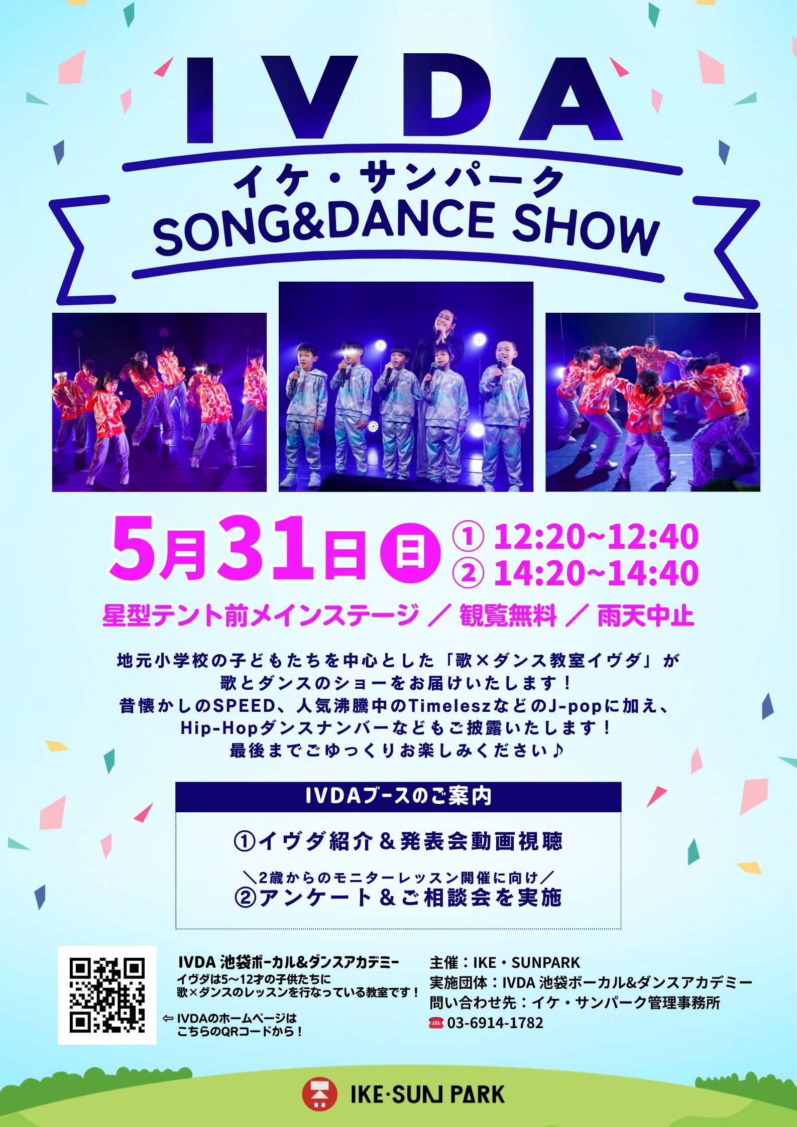 JP EN 新着情報 TOP 新着情報 【5月31日(日)】IVDAイケ・サンパークSONG&DANCE SHOW 開催! NEWS 2026.04.09 【5月31日(日)】IVDAイケ・サンパークSONG&DANCE SHOW 開催! IVDAイケ・サンパークSONG&DANCE SHOW 開催日:5/31(日) 時間:①12時20分~12時40分 ②14時20分~14時40分 内容:近隣小学校に通う生徒さんの歌とダンスのショー 主催:IKE・SUNPARK 実施団体:IVDA池袋ボーカル&ダンスアカデミー お問い合わせ:イケ・サンパーク管理事務所 前へ一覧に戻る次へ