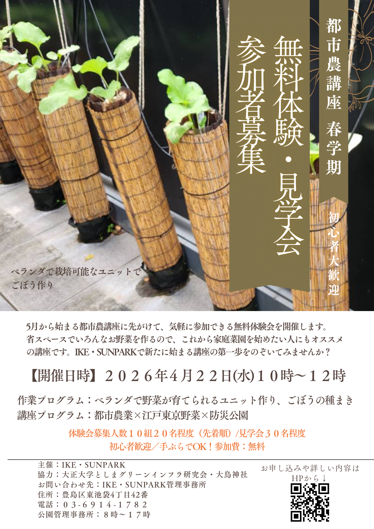 JP EN 新着情報 TOP 新着情報 都市農講座はじまります! NEWS 2026.04.07 都市農講座はじまります! この春から新たな講座「都市農講座」が始まります。 省スペースでいろんなお野菜を作るので、これから家庭菜園を始めたい人にもオススメの講座です。 情報は随時更新します! お申込みはこちら☟ https://form.amenis.co.jp/form/a02d76e190/input 前へ一覧に戻る次へ